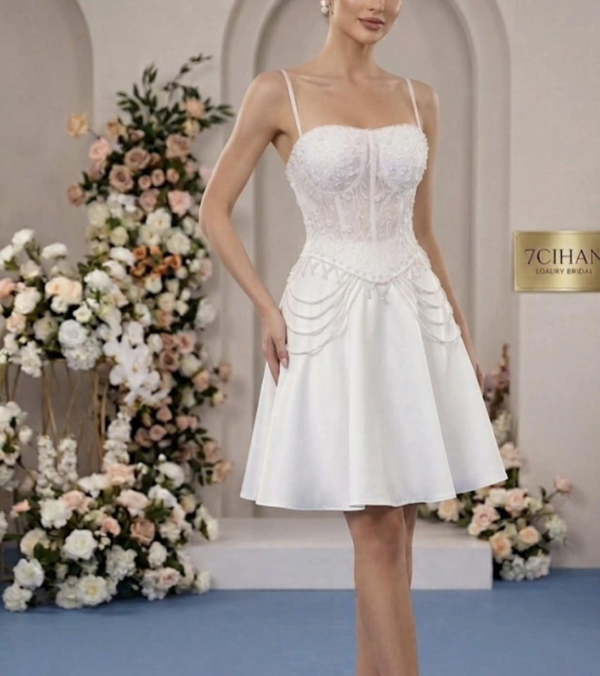 Düğün gecenizin en özgür anlarına eşlik etmek için tasarlanan bu mini after party elbisesi, el işçiliği inci detayları ve kusursuz kalıbıyla dikkat çekiyor. Gövde kısmındaki korse formu vücut hatlarınızı zarifçe vurgularken, omuzlardan dökülen inci askılar lüks bir dokunuş sunuyor.