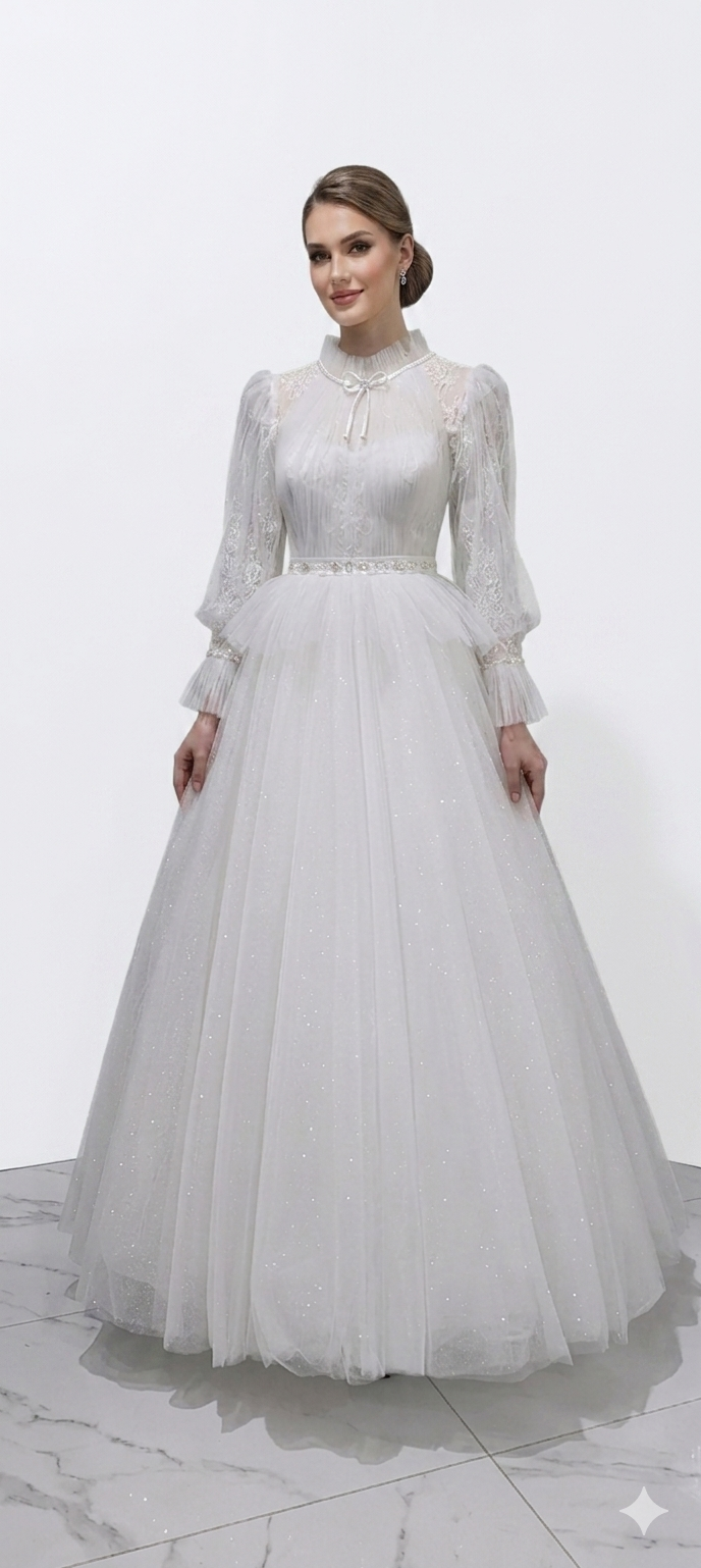 En özel gününüzde bir yıldız gibi parlamaya hazır mısınız? 7Cihan Luxury Bridal koleksiyonunun en seçkin parçalarından biri olan bu ışıltılı tül gelinlik, zarafeti ve lüksü modern bir silüette birleştiriyor.