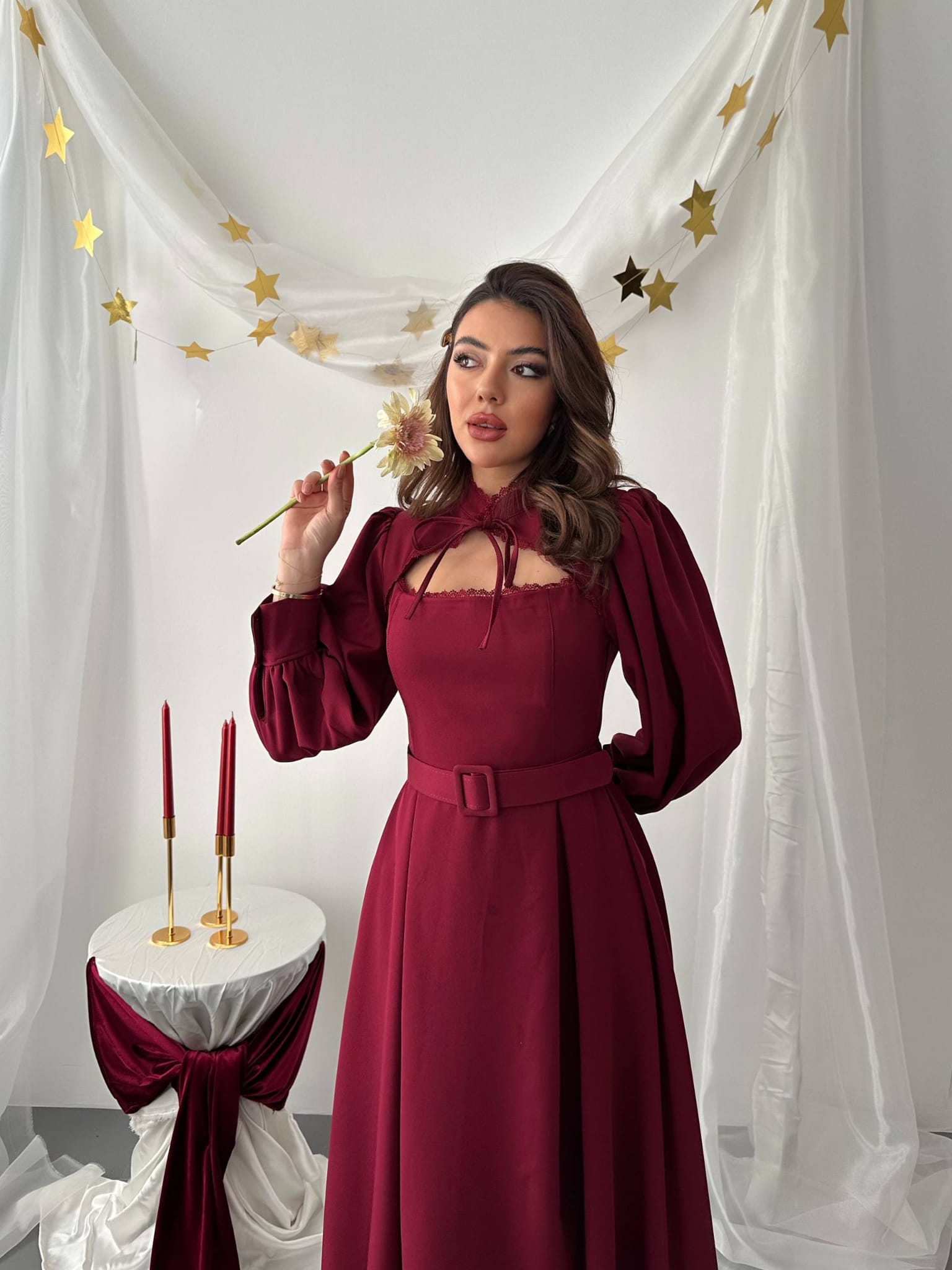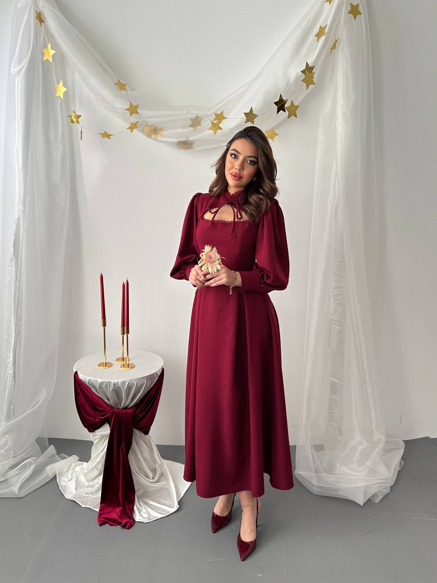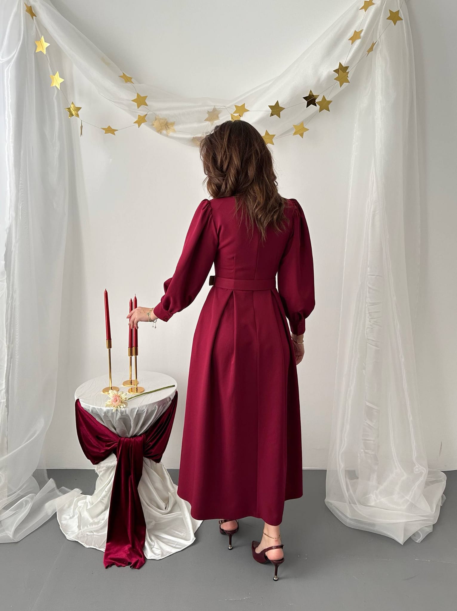 📌Zarafetin Atlas Dokusuyla Buluşması: Bordo Pencere Yaka Elbise👈