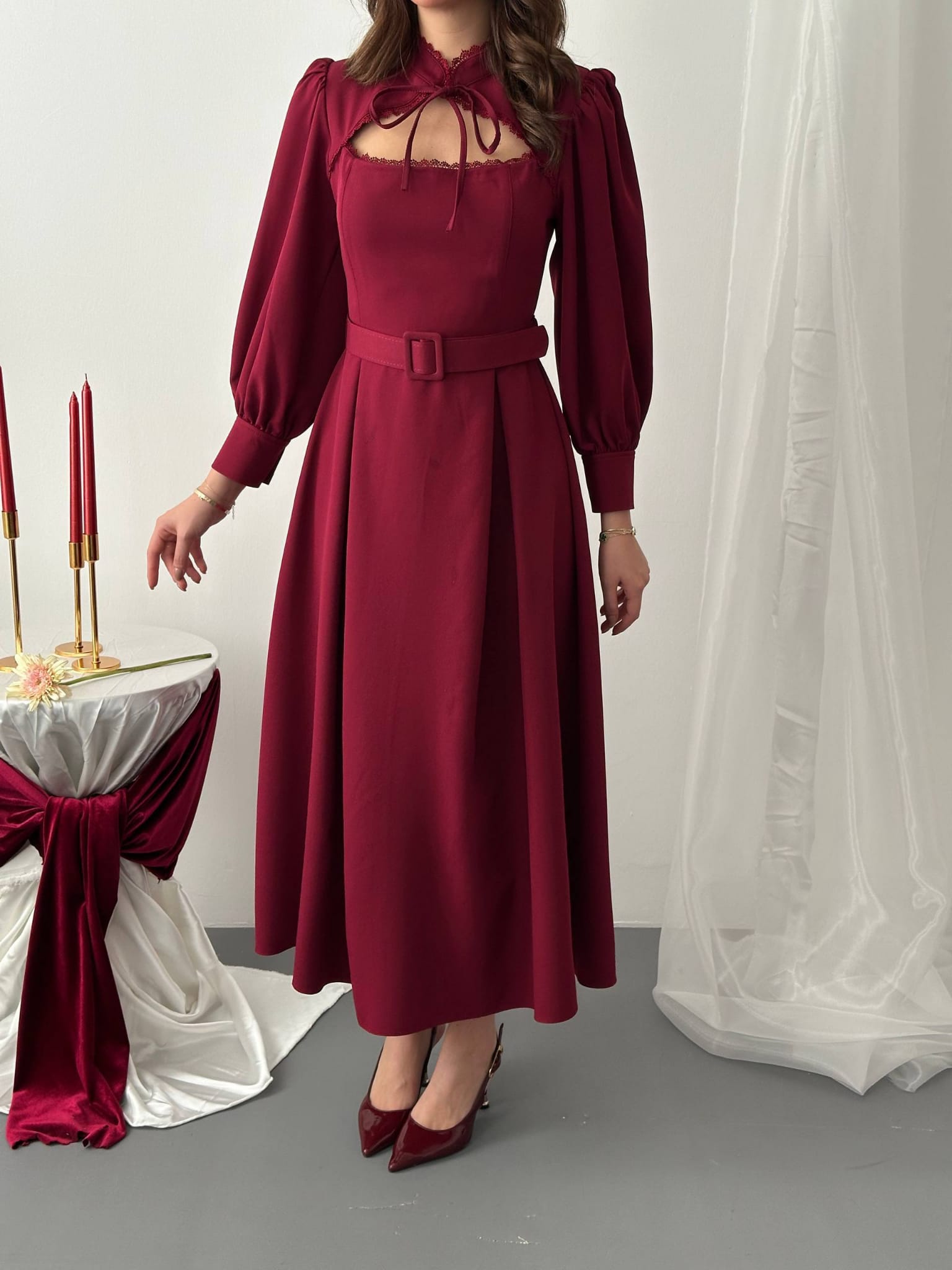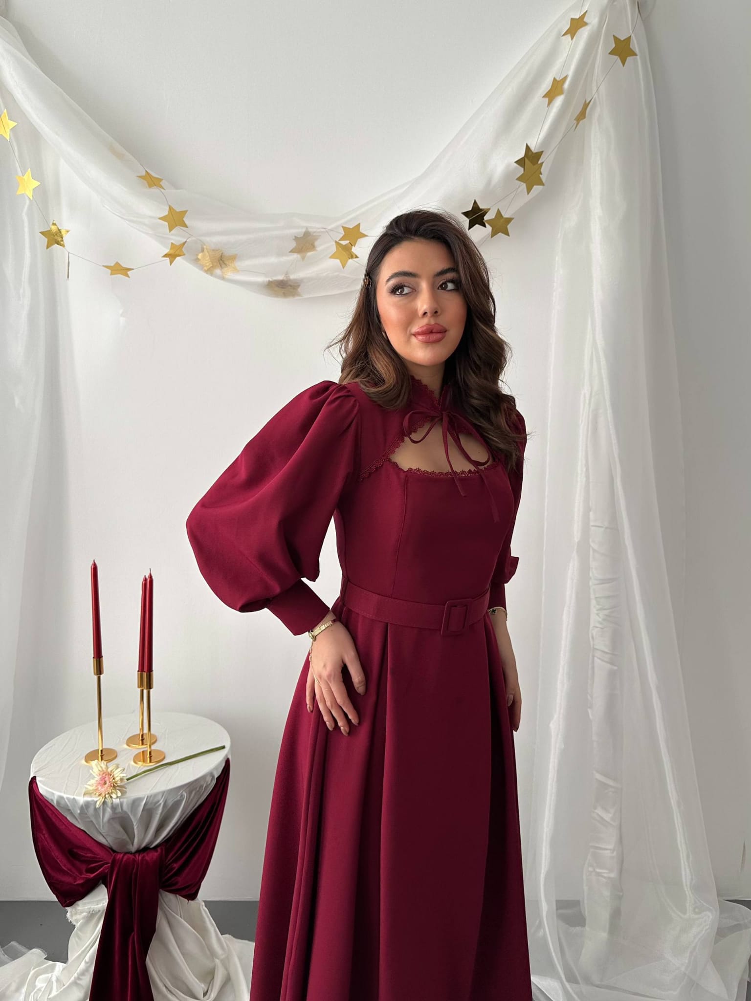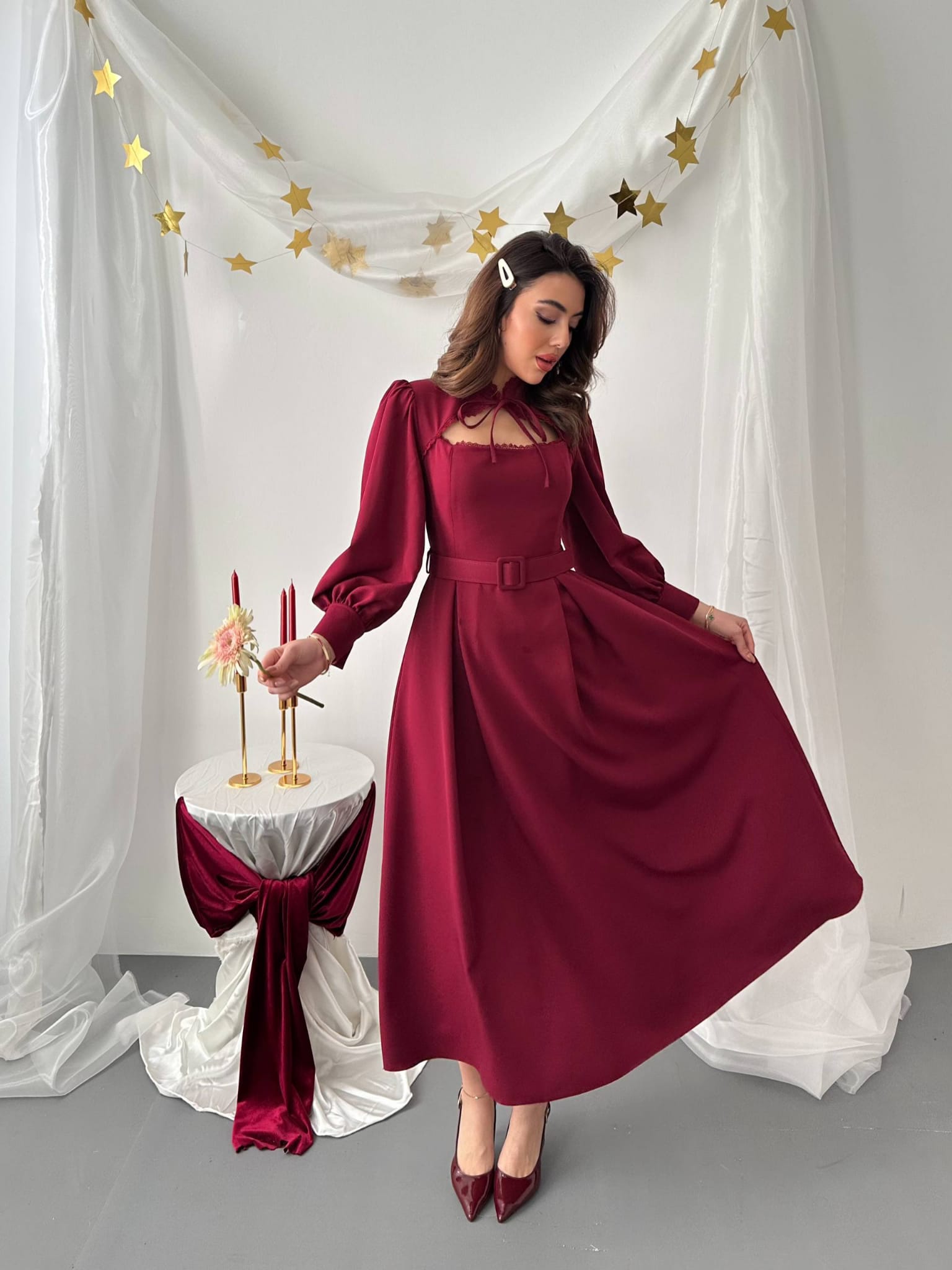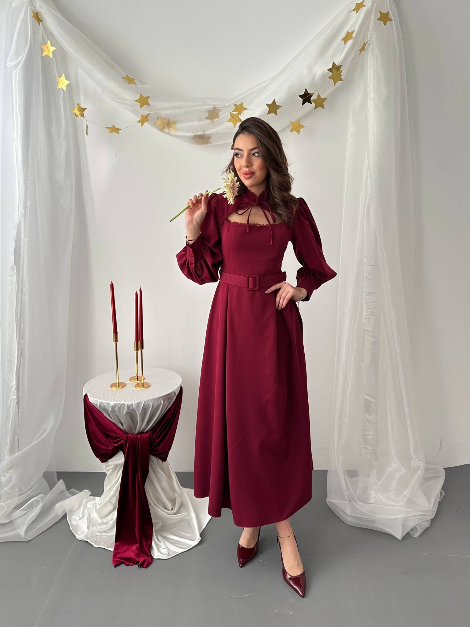 📌Zarafetin Atlas Dokusuyla Buluşması: Bordo Pencere Yaka Elbise👈