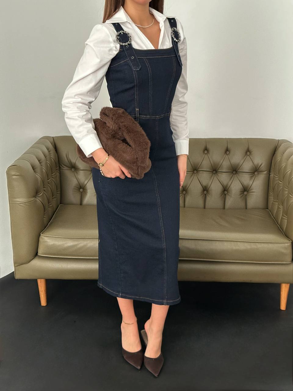 Denim elbisenin en büyük avantajı, her türlü kıyafetle kombinlenebilmesidir. Sneakers, botlar, sandaletler veya topuklu ayakkabılarla mükemmel bir uyum sağlar. Aynı zamanda farklı aksesuarlarla zenginleştirerek gündüzden geceye geçiş yapabilirsiniz. Örneğin; klasik bir çanta ve sade bir kolye ile gündüz ofis şıklığı yaratırken, akşam yemeği için abartılı küpeler ve şık bir çanta tercih edebilirsiniz.