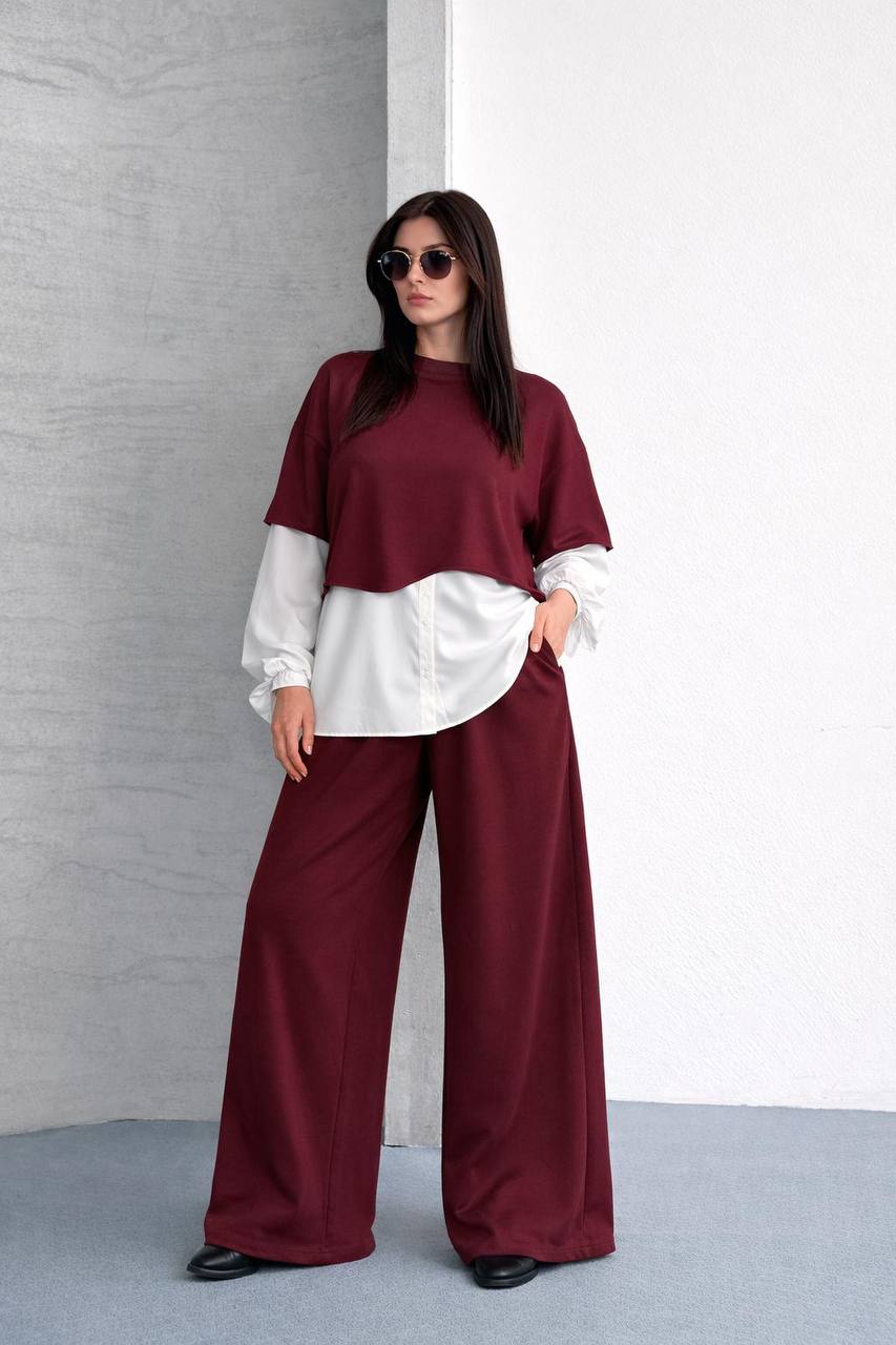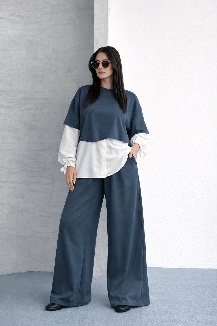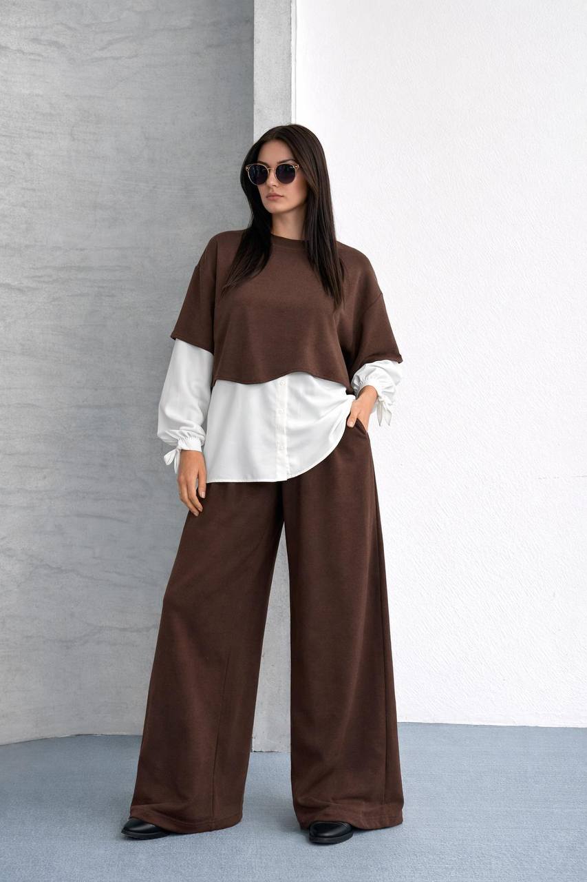 - Detay: Beli lastikli, geniş paça pantolon; gömlek görünümlü sweatshirt üst.