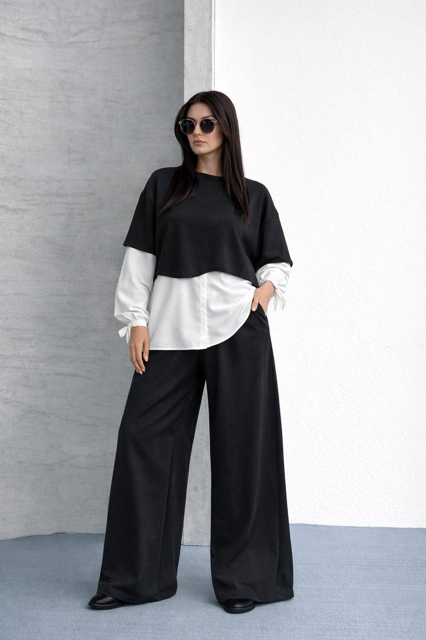 Günlük şıklığınızı bir üst seviyeye taşıyın! Bu özel tasarım ikili takım, antrasit rengin asaletini beyaz gömlek detayının ferahlığıyla birleştiriyor. Geniş paça pantolonu ve katmanlı görünüm sunan üst parçasıyla hem ofis stilinde hem de hafta sonu gezmelerinde konforu ve zarafeti bir arada sunar.