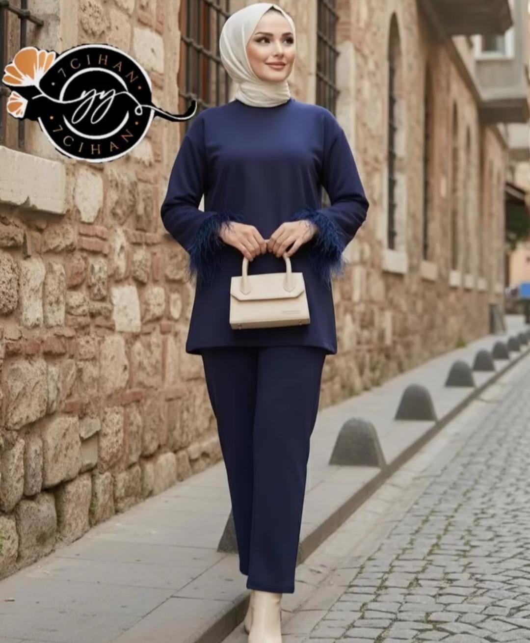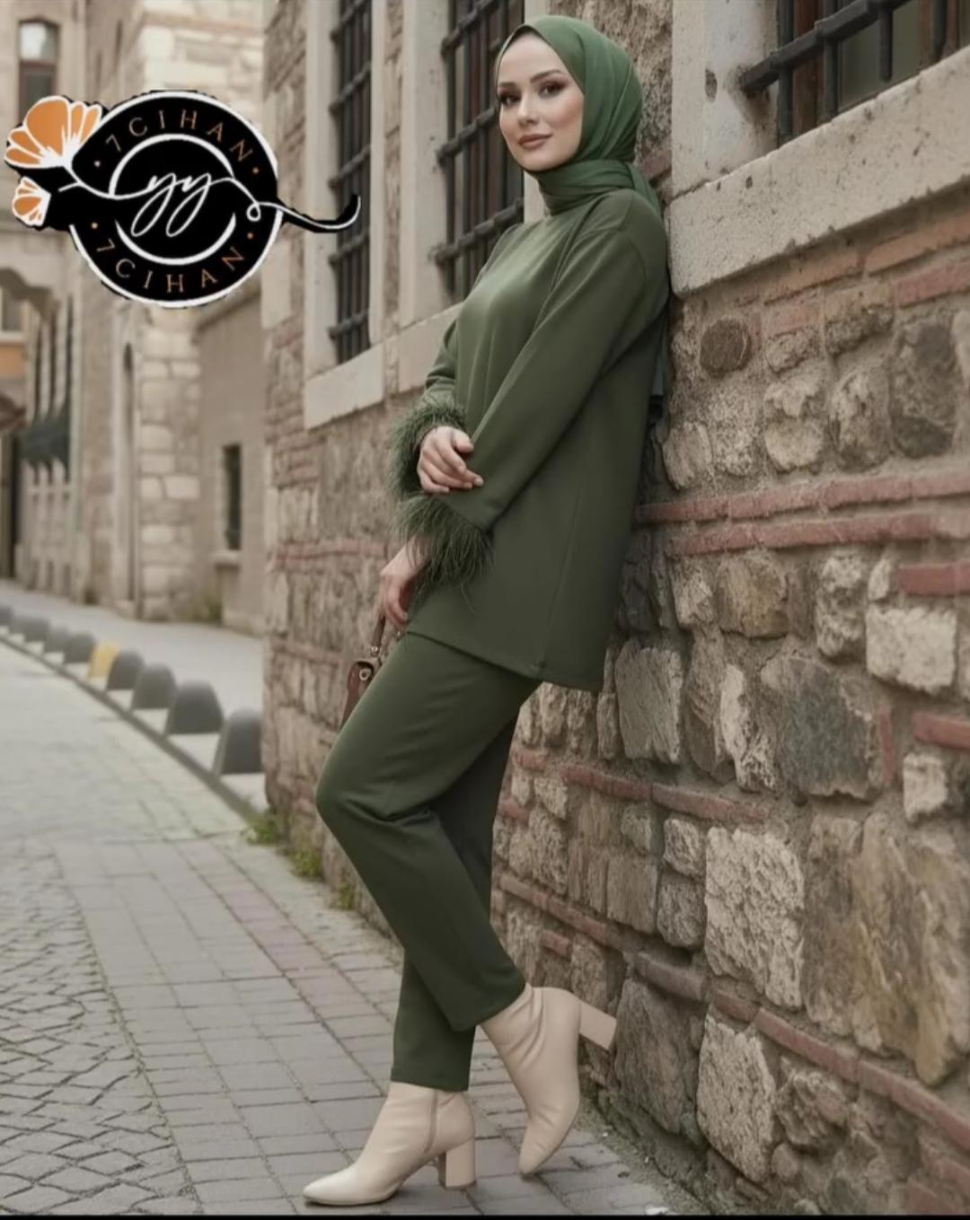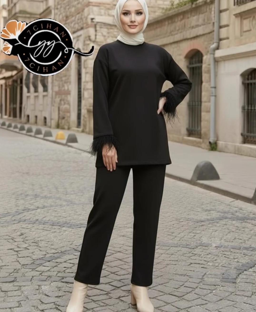 7Cihan koleksiyonunun en seçkin parçalarından biri olan bu tüylü detaylı ikili takım, modern kadının gardırobuna şıklık katmak için tasarlandı. Bilek kısmındaki zarif tüy detayları, klasik tunik ve pantolon kombinine sofistike bir hava katarken; kaliteli krep kumaşı gün boyu konfor sunar.