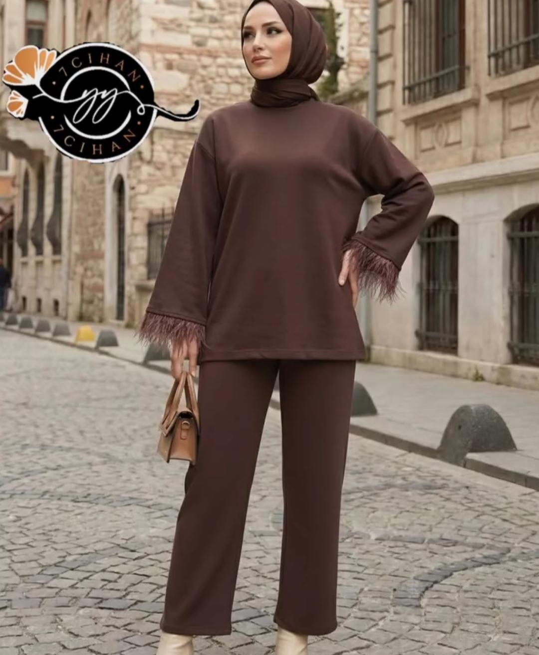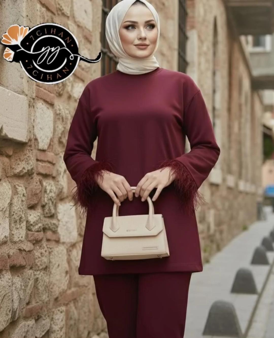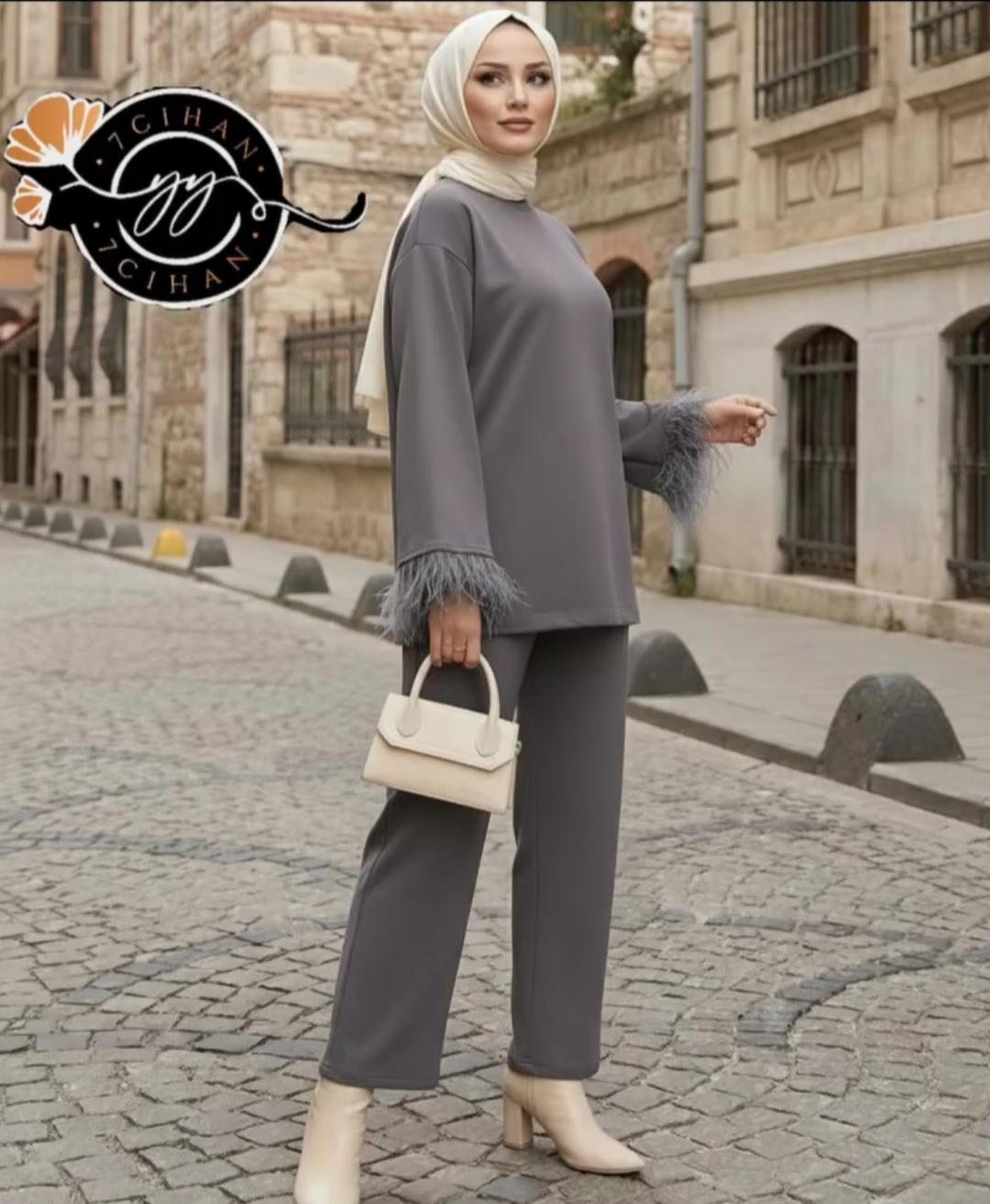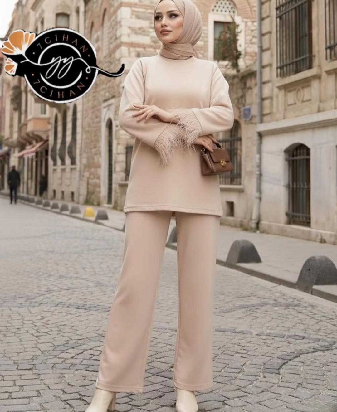 7Cihan koleksiyonunun en seçkin parçalarından biri olan bu tüylü detaylı ikili takım, modern kadının gardırobuna şıklık katmak için tasarlandı. Bilek kısmındaki zarif tüy detayları, klasik tunik ve pantolon kombinine sofistike bir hava katarken; kaliteli krep kumaşı gün boyu konfor sunar.