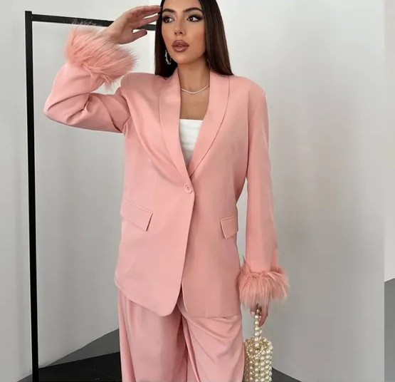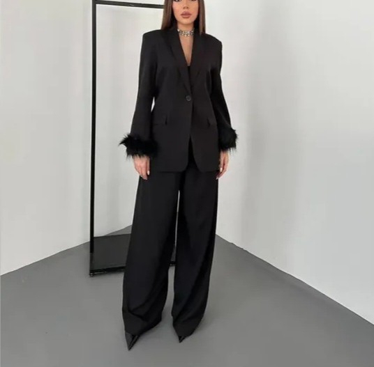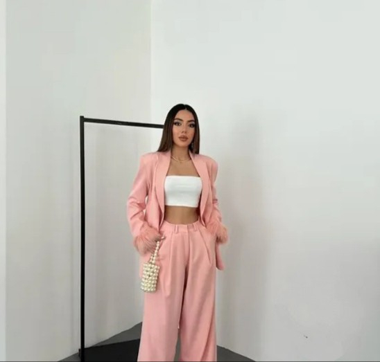 #Tüy detaylı takım, #kadın blazer takım, #ikili takım, #davet elbiseleri, #tüylü ceket, #geniş paça pantolon, #lüks kadın giyim, #şık ofis stili, #gece kıyafeti, #pembe blazer takım, #siyah klasik takım, #trend kombinler, #2024 kadın moda.