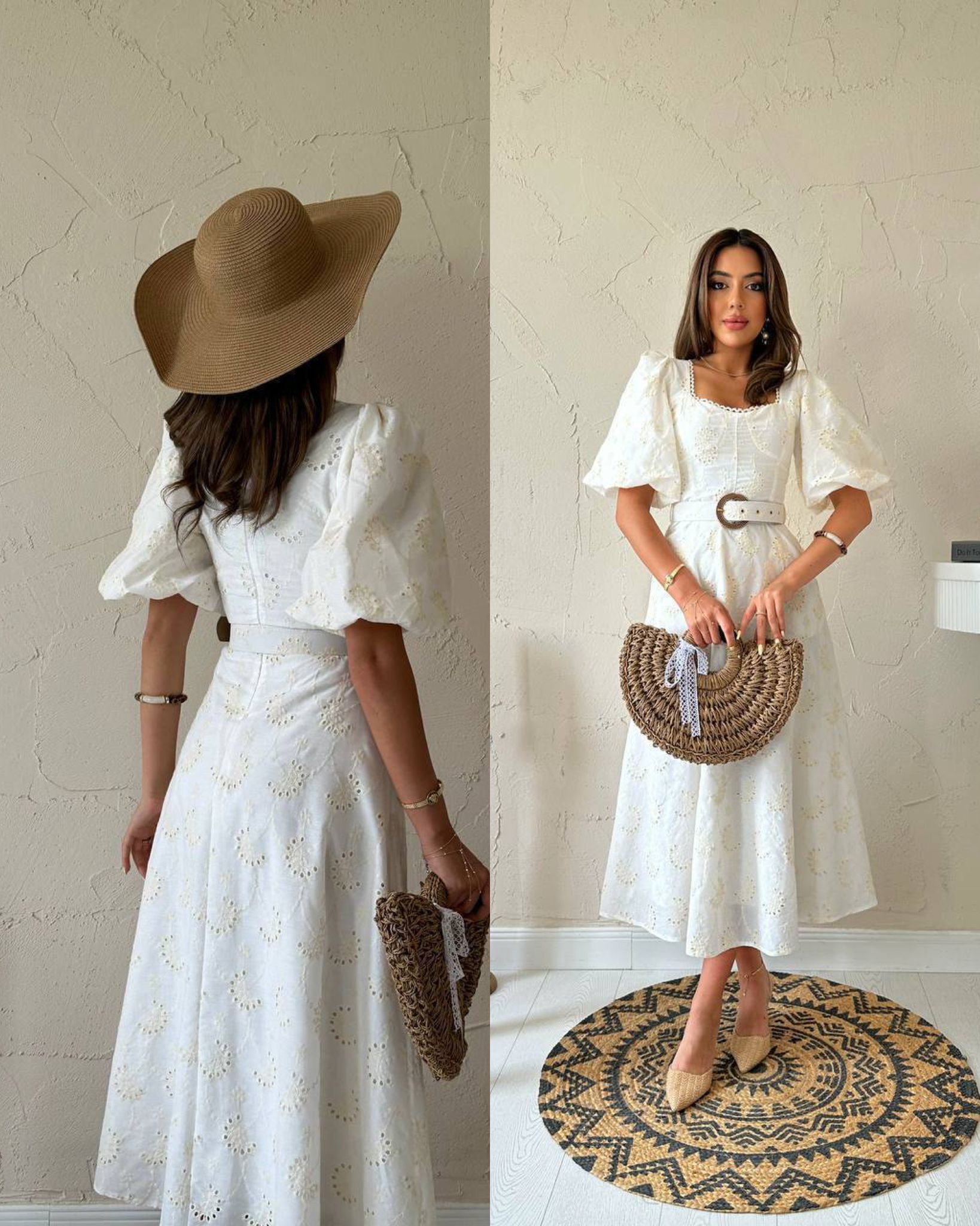 7Cihan Fisto Nakışlı Kare Yaka Beyaz Maxi Elbise