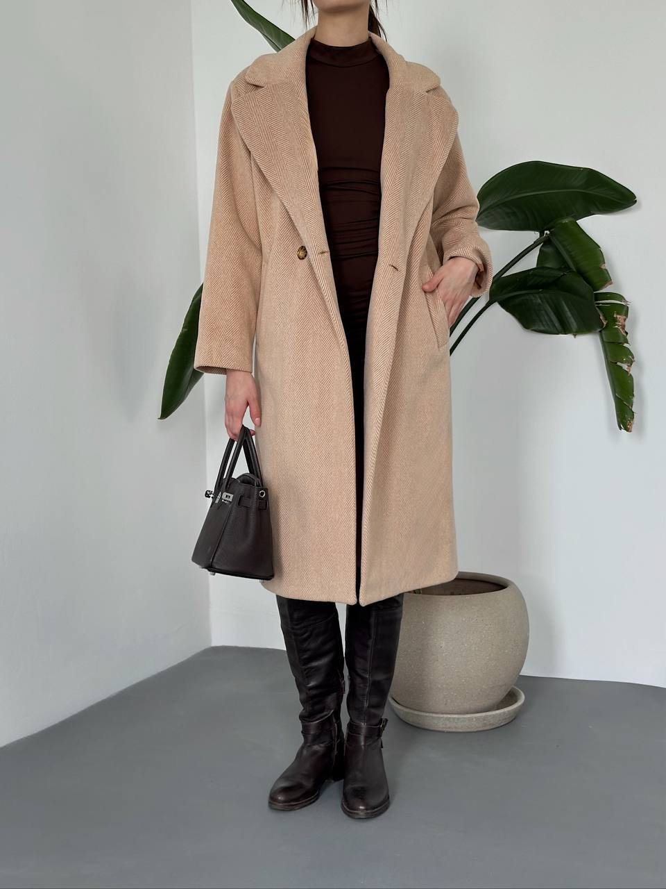 ZAMANSIZ ŞIKLIK: BEJ BALIKSIRTI DESENLİ GENİŞ YAKA UZUN PALTO